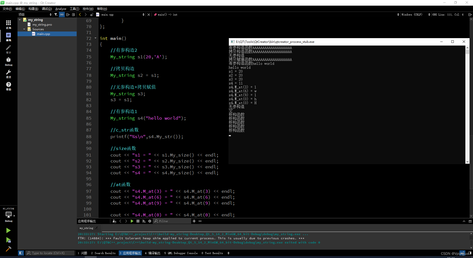 本文展示了如何在C++中封装一个名为My_string的类,该类模仿了std::string的功能。类包含了无参构造、有参构造(两种情况)、析构、拷贝构造、拷贝赋值函数,以及c_str、size、empty和at等成员函数。在main函数中,对这些功能进行了实例化和使用演示。
