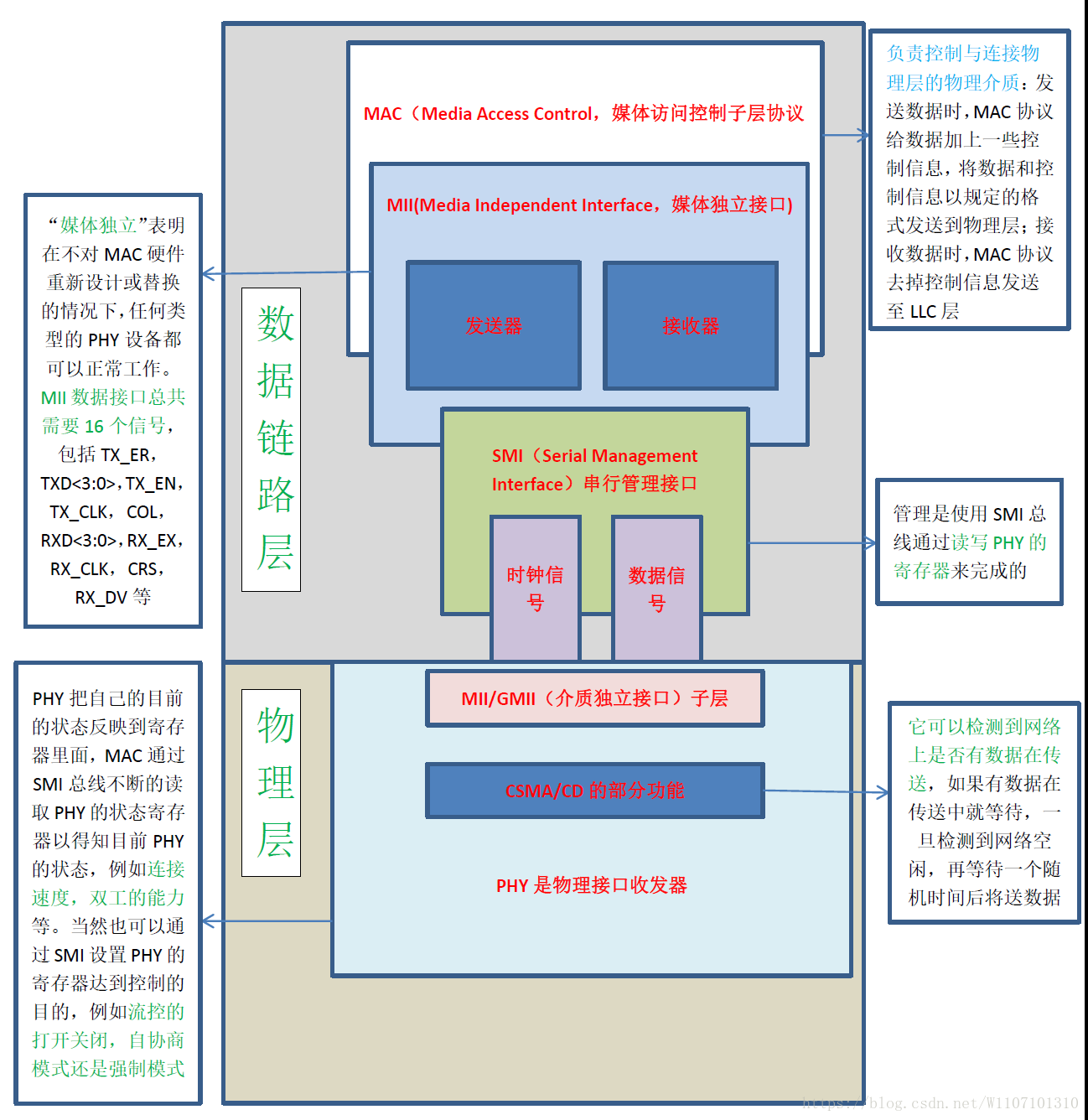 而图中我们用绿色方框圈起来的部分为物理层PHY,而用蓝色方框圈起来的部分为数据链路层MAC。现在可能有同学要问了:那么MAC和PHY又是什么那?