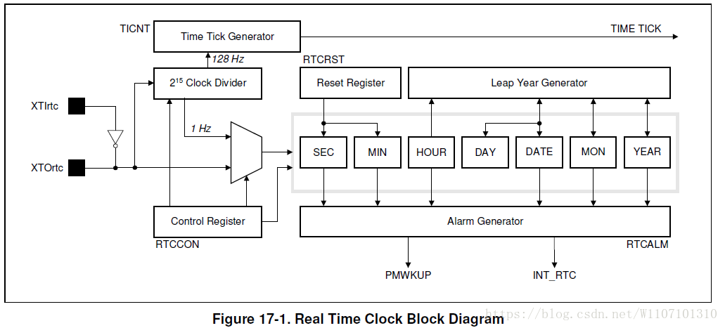 在断电模式和正常模式,RTC会在特定的时刻产生时钟信号。在正常操作模式下,时钟中断被激活。而在断电模式下,电源管理唤醒信号被激活同时时钟中断被激活。而RTC时钟寄存器(RTCALM))决定了时钟使能/失能状态以及时钟时间设置条件。
