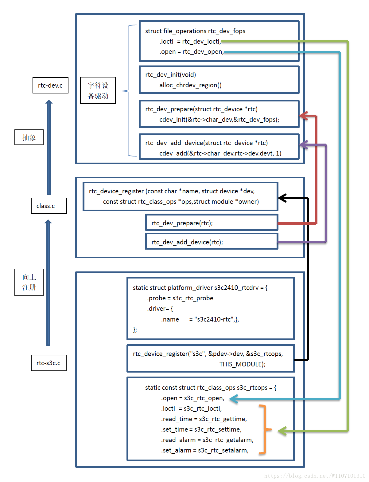 通过上面的分析,你也许就明白了,其实上面这三层是相互关联,相互调用的关系。从rtc-s3c.c ,class.c 到 rtc-dev.c经过层层抽象,将RTC设备抽象到字符设备实现对RTC设备向内核的注册,而又通过rtc-dev.c对rtc-s3c.c 的回调实现从抽象到具体的操作。上面就是这三层的关系。而我们现在分析各个层中的函数来详细了解他们内部的关系。