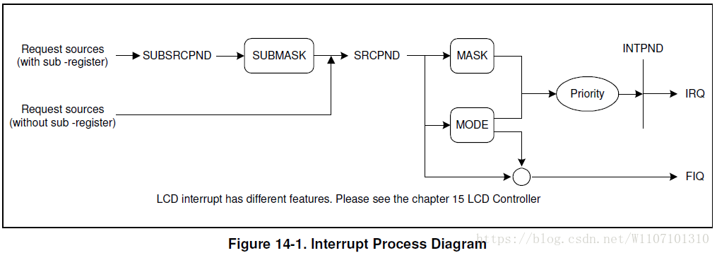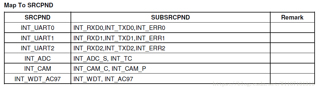 从上面的中断处理框图和SRCPND映射图中,我们可以看出不管是触摸屏子中断还是ADC中断,他们在触发时都会使SRCPND位中对应的ADC位(bit[31])设置为高电平。同时在中断触发函数中我们只能注册一个中断处理函数。因为在中断偏移寄存器(INFOFFSET)中只有ADC位(bit[31]),而并无触摸屏的位。