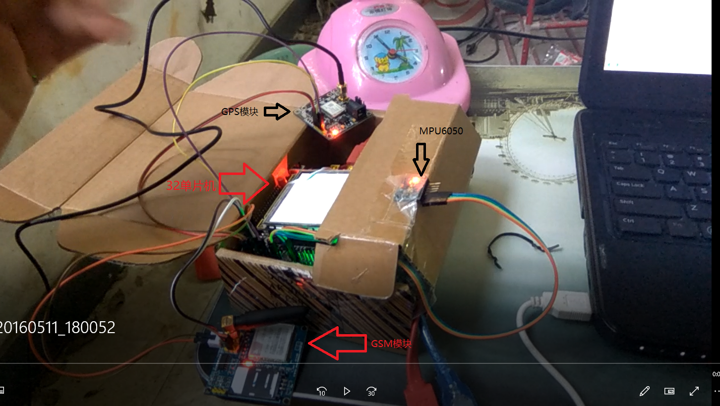 在没有家人在场的情况下,当老人不小心摔倒而且没有能力进行自救时或者老人遇到其他的突发危险而现场没有家人帮助时,如果没有及时得到救治或者帮助,这很可能会导致老人瘫痪甚至威胁老人的生命安全。在这种情况下,我们采用集三轴加速度和三轴陀螺仪于一体的MPU6050模块对老人是否跌倒进行监测。当老人跌倒时,以STM32为核心的中央控制系统将会向周围人发出发出声光警报。如果老人有能力自己站起来,可以自行解除警报。当老人没有能力自己站起来时,装置将在警报响起10 S后通过GSM模块将从GPS模块获得的经纬度信息以短信形式发送到指定联系人。该指定联系人可以通过智能手机搜索得出老人的地址。而且本装置还有一键SOS功能,当老人碰到其他危险且没有能力自救时,可以通过按下SOS按键直接将自己的地理信息通过短信形式发送给指定联系人。