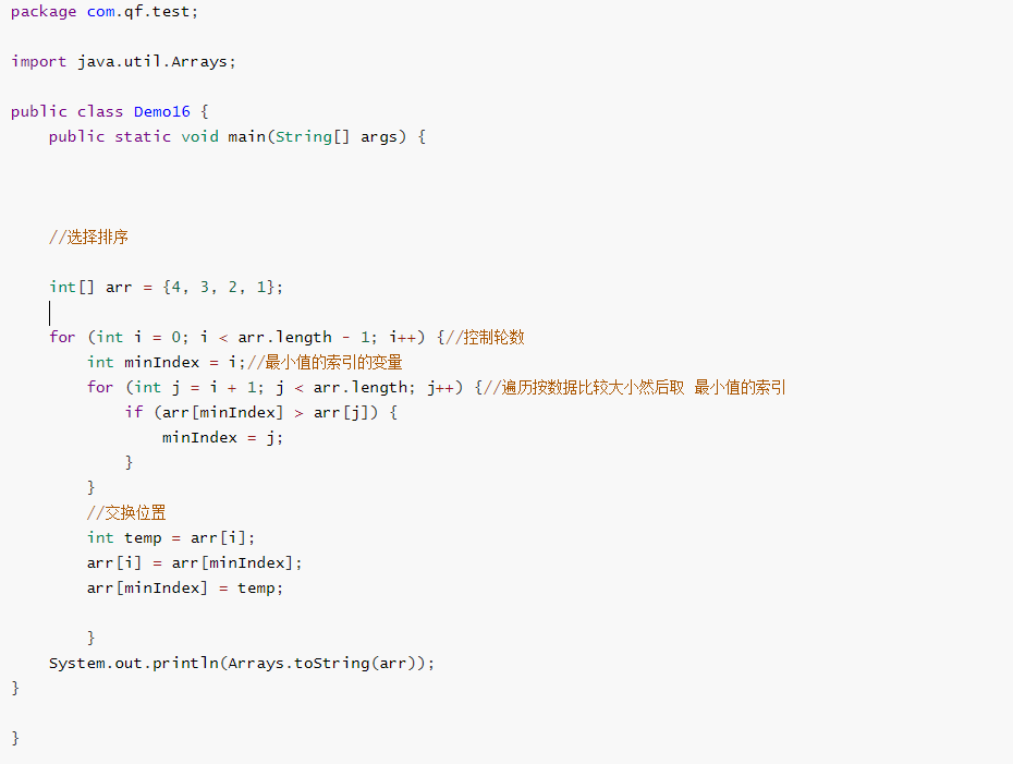 再遍历一遍(除了第一个数) 找最小值的索引 2 然后交换位置 {1, 2, 3,4}