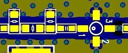 6)对某些敏感电路、有强烈辐射源的电路分别放在屏蔽腔内,装配时屏蔽腔压在PCB表面。PCB在设计时要加上“过孔屏蔽墙”,就是在PCB上与屏蔽腔壁紧贴的部位加上接地的过孔。如下图所示,要有两排以上的过孔,两排过孔相互错开,同一排的过孔间距在100mils左右。