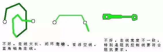 1)走线要求尽量最短,不走闭环,不走锐角直角,线的宽度一致,没有浮空线。