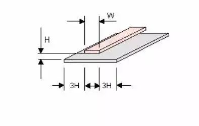 1)PCB顶层走RF信号,RF信号下面的平面层必须是完整的接地平面,形成微带线结构。如图所示。要保证微带线的结构完整性,必须做到:同层内微带线要做包地铜皮处理,建议地铜皮边缘离微带线边缘有3H的宽度。H表示介质层厚度。在3H范围内,不得有其它信号过孔。禁止RF 信号走线跨第二层的地平面缝隙。非耦合微带线间要加地铜皮,并在地铜皮上加地过孔。