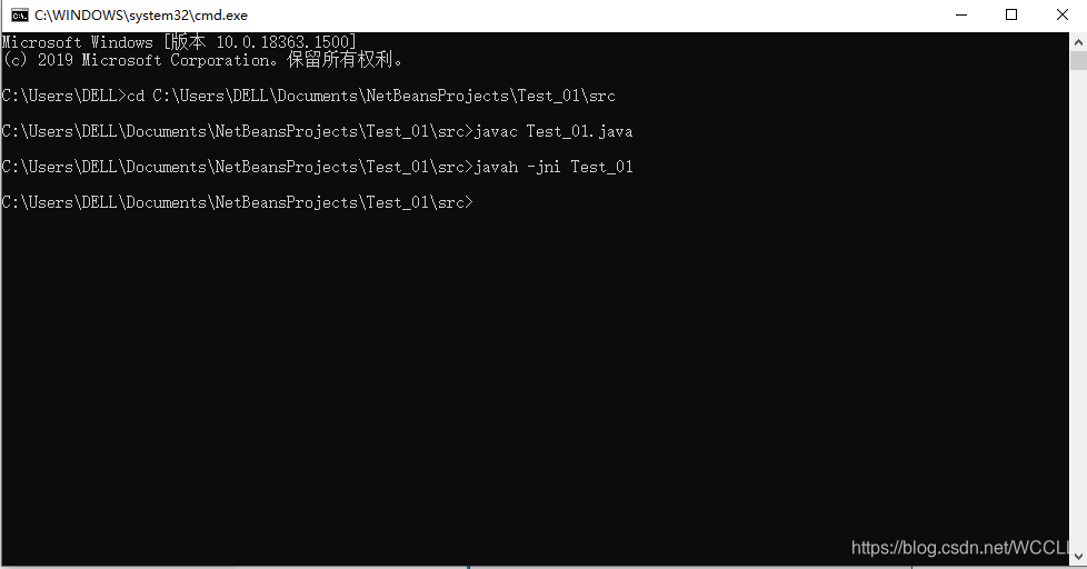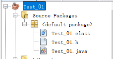 进入Test_01项目所在文件,分别输入javac Test_01.java(生成.class文件)和 javah -jni Test_01(生成C++头文件)