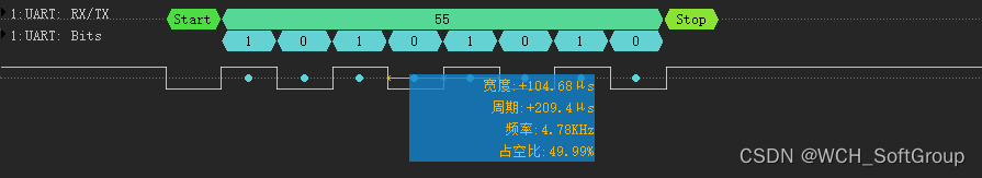 串口波特率也称比特率,常用表示单位为bps(比特每秒,1秒钟可传输的bit总数)。以9600波特率为例:1秒钟串口信号线可以传输9600个bit位,1个位所需时间就是1/9600秒约104us。如下图所示: