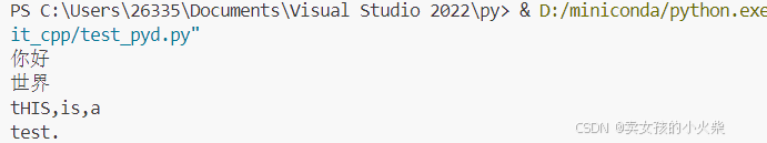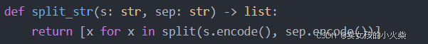 然后,split函数的返回值类型vector,返回给python之后就是列表类型所以函数最后我们用列表推导式进行操作。但列表推导式中的x还是bytes类型,因为vector<string>中的string到python这边是bytes。因此整个split_str函数的返回值是list[bytes]类型。当然你也可以写成: