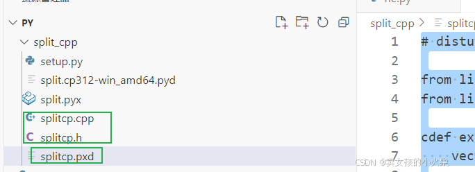 上面的步骤是将cpp代码导出交给Cython(即用pxd引入给Cython),接下来要编写pyx文件,告诉Cython如何导出split函数给Python调用。新建一个split.pyx文件(注意:pyx文件不能和cpp文件,pxd文件的名字相同,一定不能相同)。
