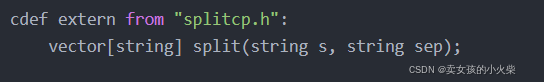 第三行和第四行的代码,导入了c++标准库中的vector和string类型(注意是cimport不是import)。因为咱们要到出的函数split的参数,返回值用到了这两个类型,所以需要导入,不然Cython不认识这是啥类型。