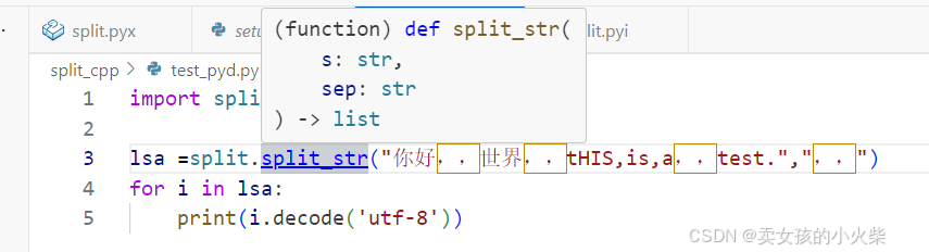 调用pyd模块时候会发现,import split有波浪线,这是因为IDE(VS Code)并不能识别pyx文件,pyd文件为Python的拓展包文件,如果你有强迫症非要让ide正确识别,可以写一个split.pyi文件这个就是类似cpp头文件一样,用来声明函数定义的。直接把pyx中的调用函数头复制到pyi文件再加上...就行了(注意,pyi文件不要写函数具体定义内容)