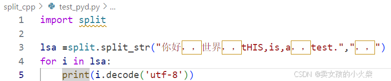 类型)所以当Python想传str字符串时,就需要将str参数通过encode方法转成bytes,传给cpp函数split: