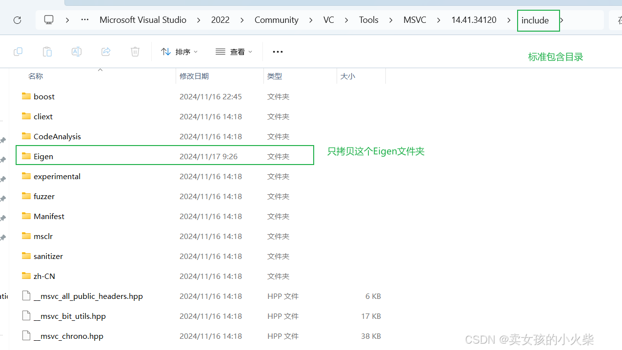 #inclide <Eigen/...> 前面加了Eigen/ 这其实对应的是上图中的文件夹,因此如果你不想cpp包含头文件的方式,就把Eigen这个文件夹,拷贝到标准包含目录中。