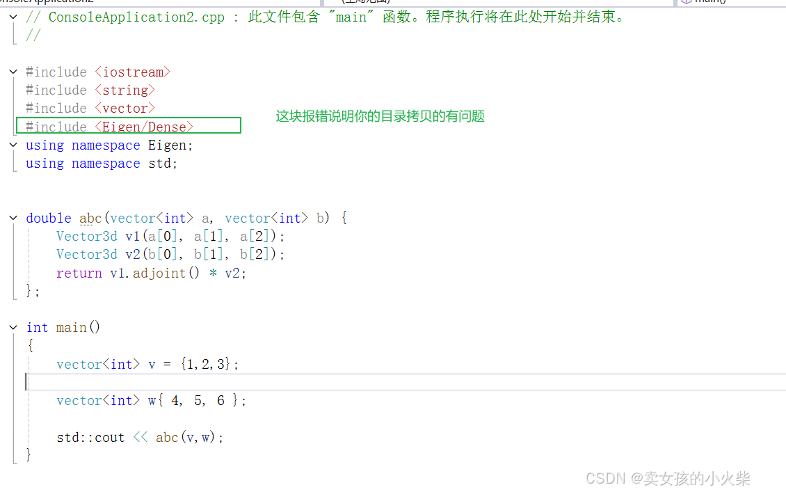 编写cpp代码:(注意:不要通过Vistual studio 的项目设置添加Eigen库,这样的话目录拷贝错了,你都无法察觉,报错就说明你目录找的不对,目录层级没整清楚)