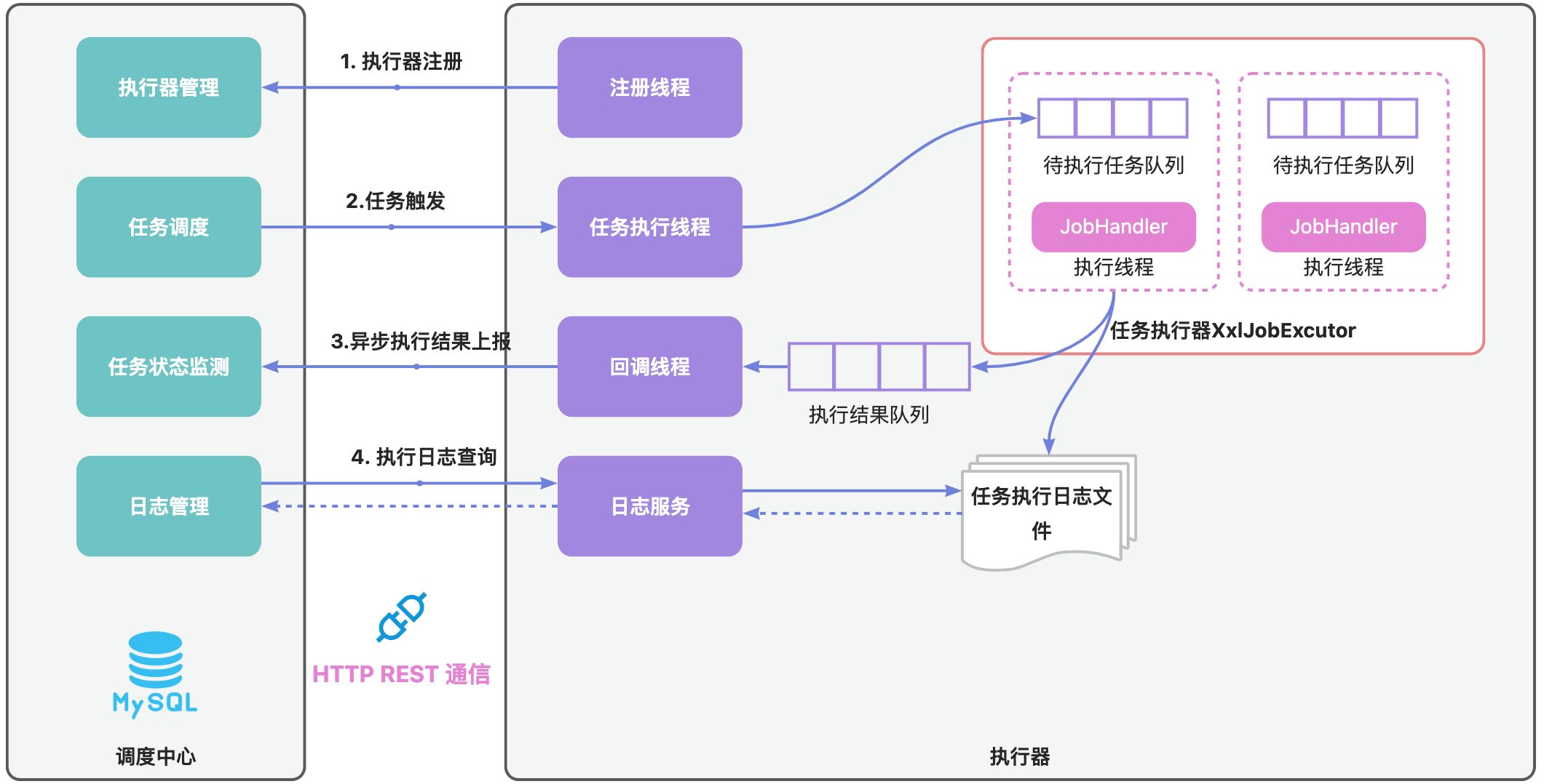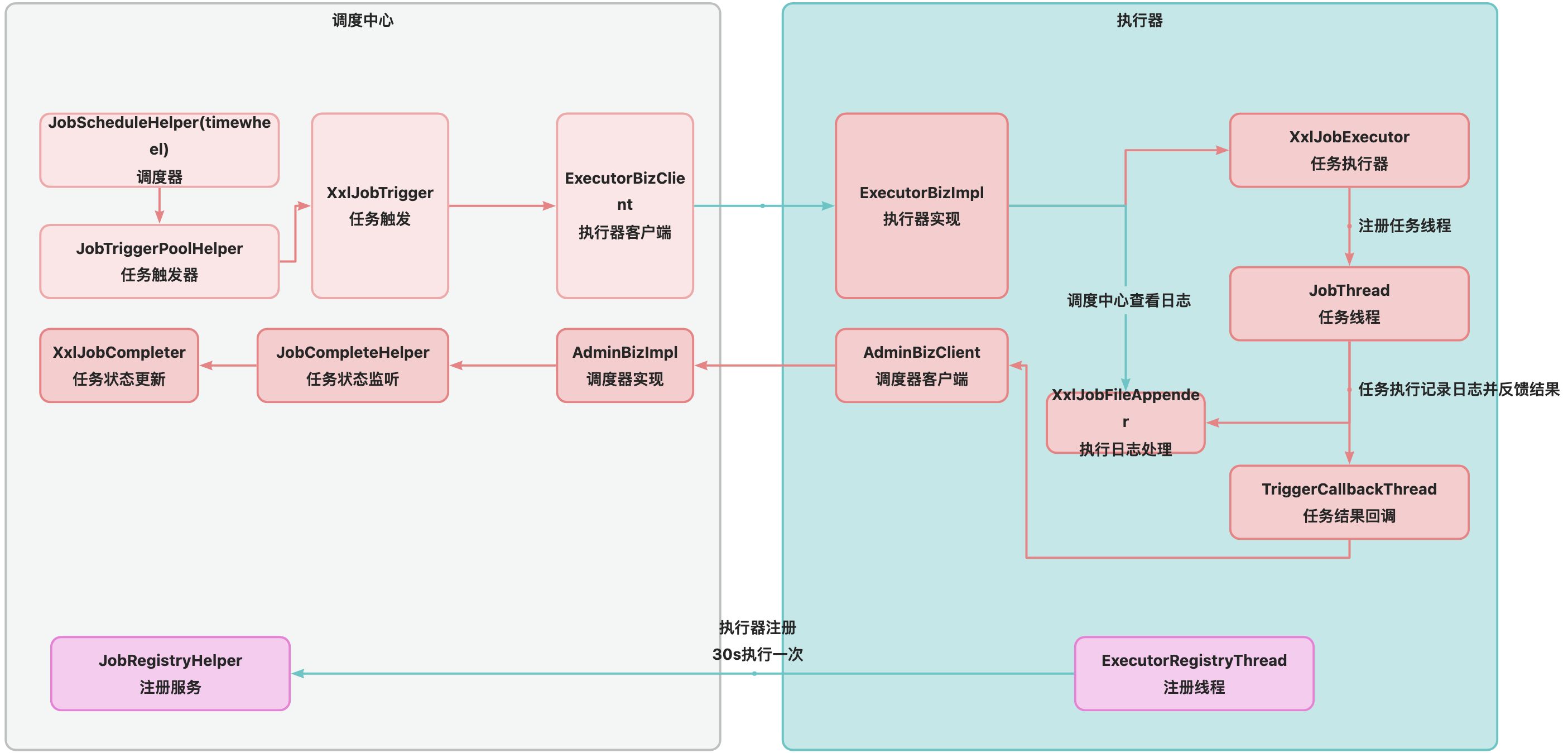 30秒执行一次,用于心跳检查。执行器销毁会取消注册。 - 调度中心根据触发时间触发调度任务。