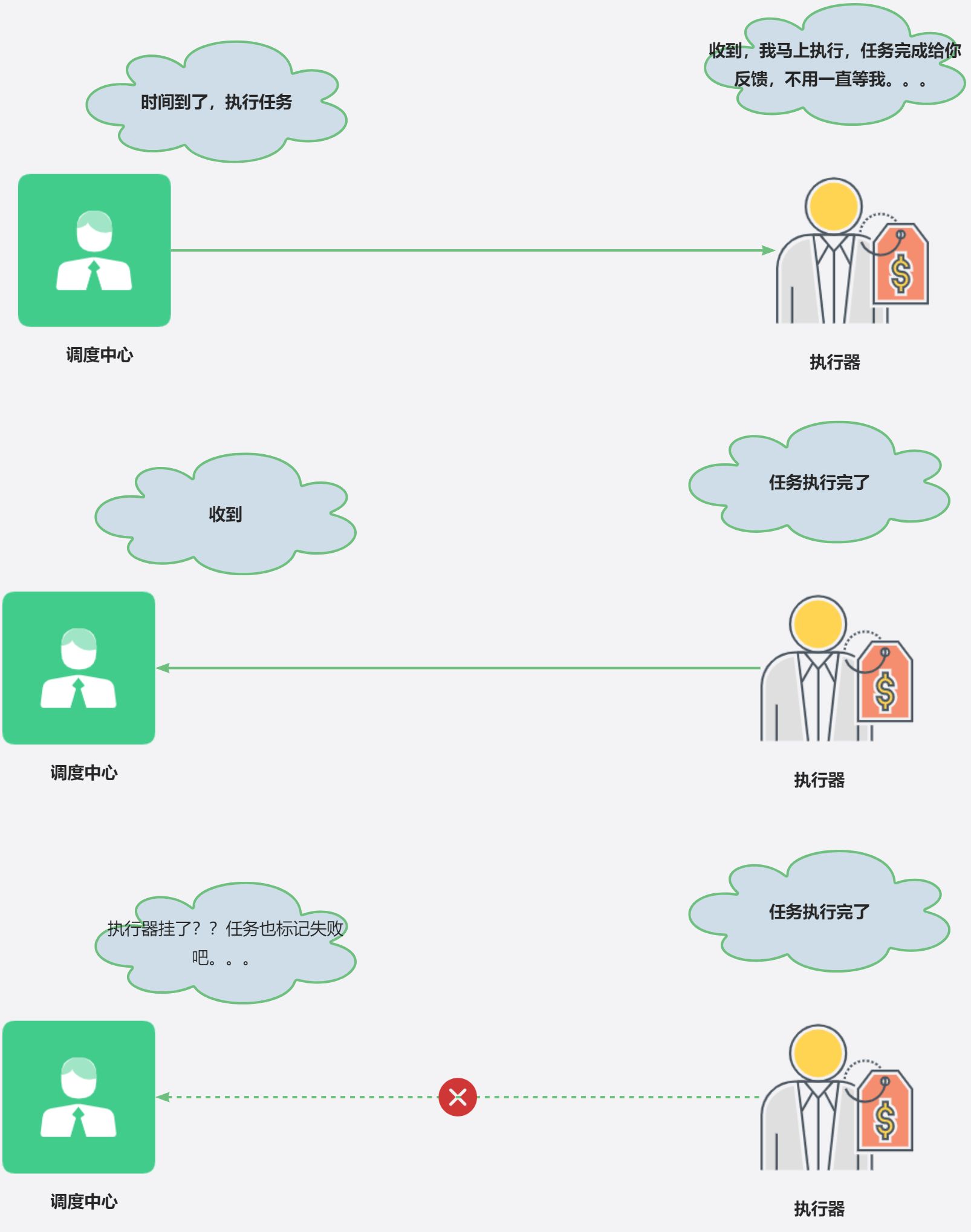 调度中心就是总览全局的Leader,具体的执行器就是需要工作的worker。Leader分配任务,worker负责任务执行。那么Leader会等worker执行完任务再去干其他事情吗?显然不行,这样效率太低了。