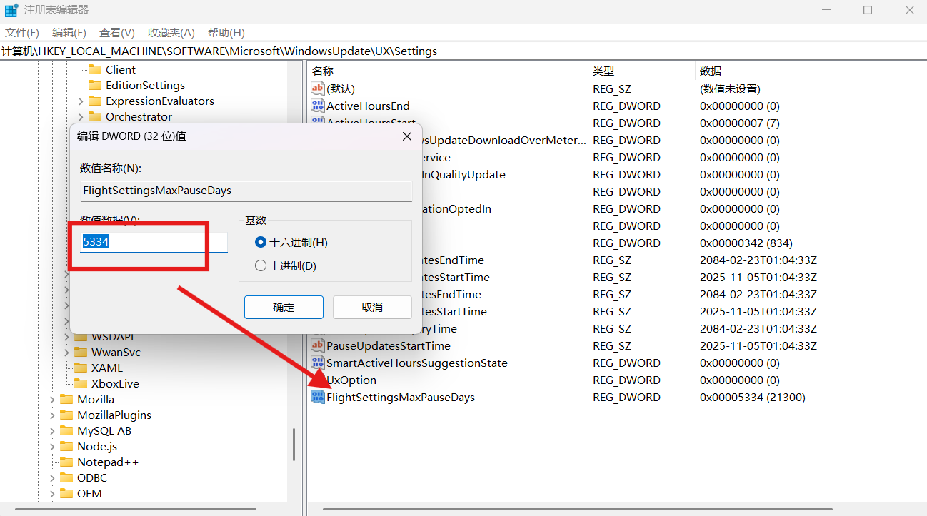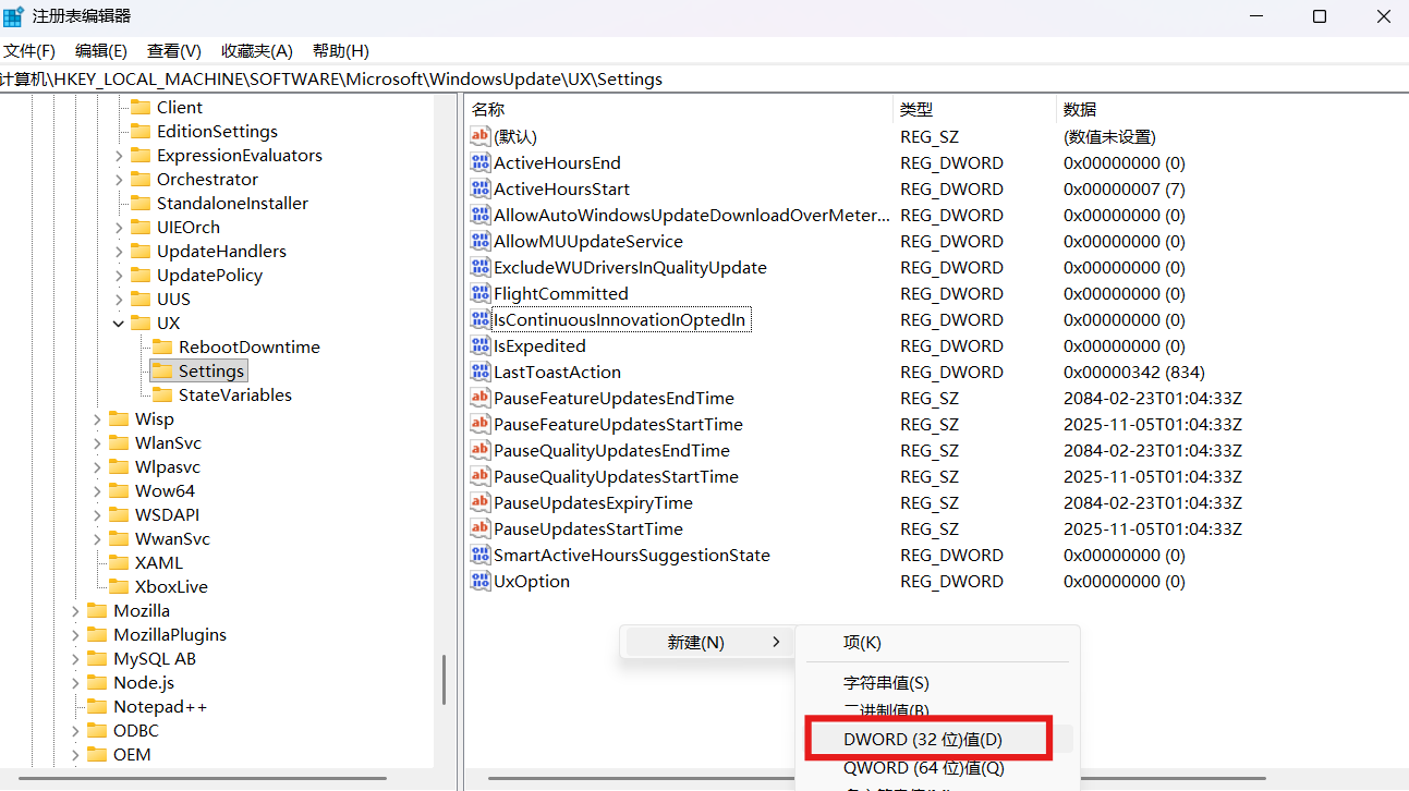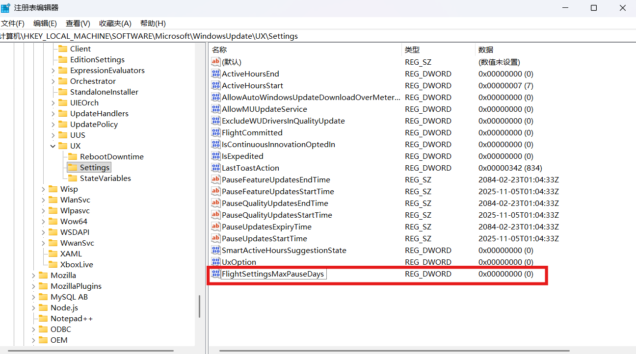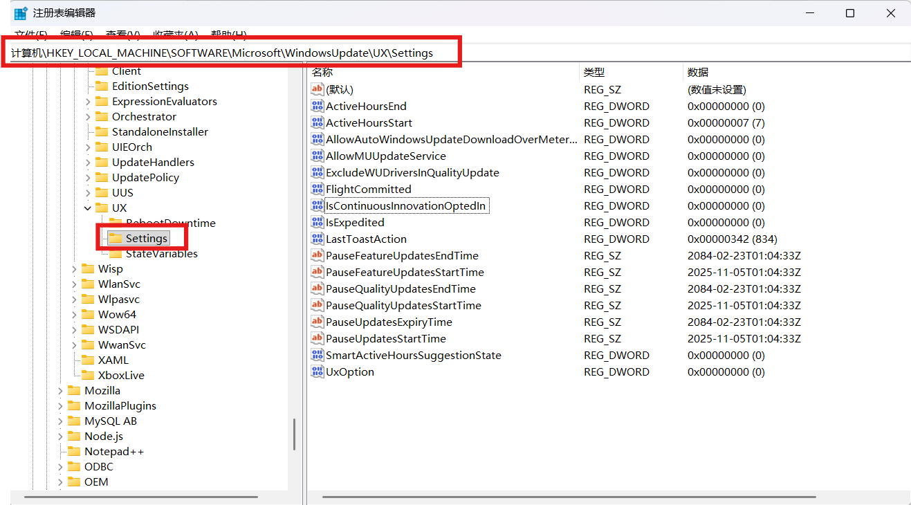 计算机\HKEY_LOCAL_MACHINE\SOFTWARE\Microsoft\WindowsUpdate\UX\Settings