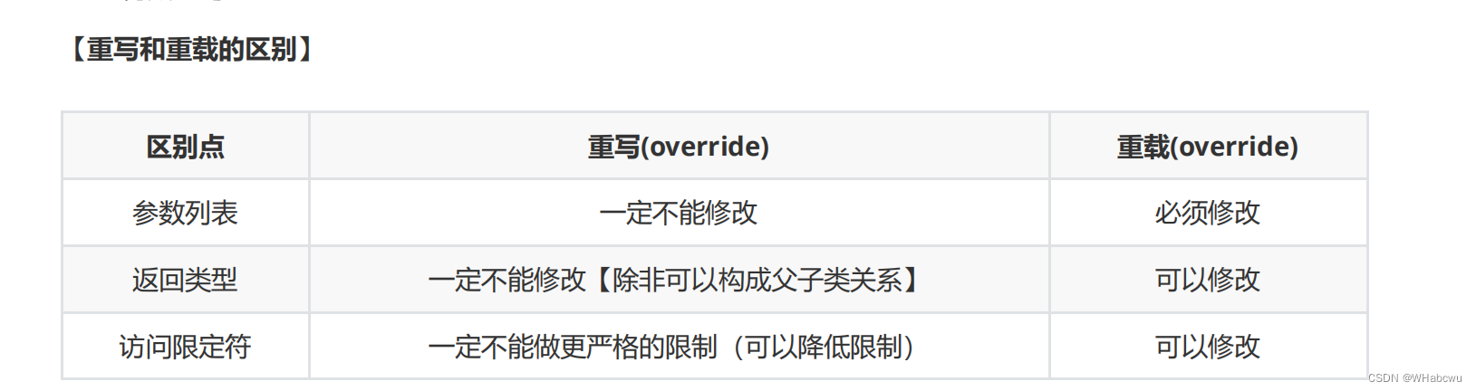 (1) 被重写的方法返回值类型可以不同 , 但是必须是具有父子关系的(2) 访问权限不能比父类中被重写的方法的访问权限更低 。例如:如果父类方法被 public 修饰,则子类中重写该方 法就不能声明为 protected(3) 父类被static、final和private修饰的方法、构造方法都不能被重写。