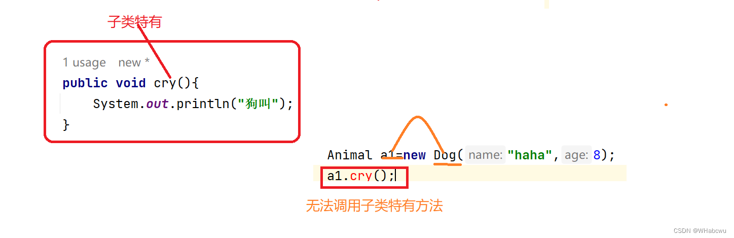 将一个子类对象经过向上转型之后当成父类方法使用,再无法调用子类的方法,但有时候可能需要调用子类特有的 方法,此时:将父类引用再还原为子类对象即可,即向下转换。