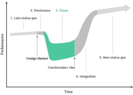 如果外来因素(或其支持者)在阻力期足够强大,而且持续地制造出大量的不安,组织就会陷入混乱期。