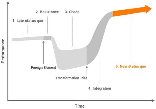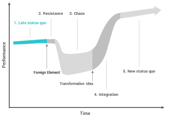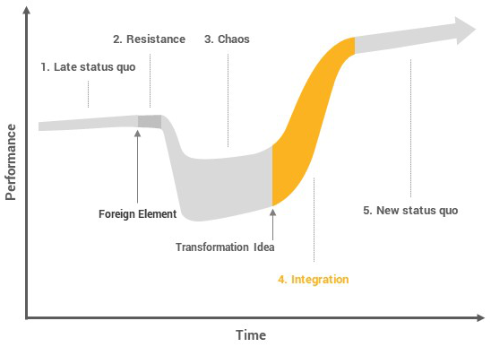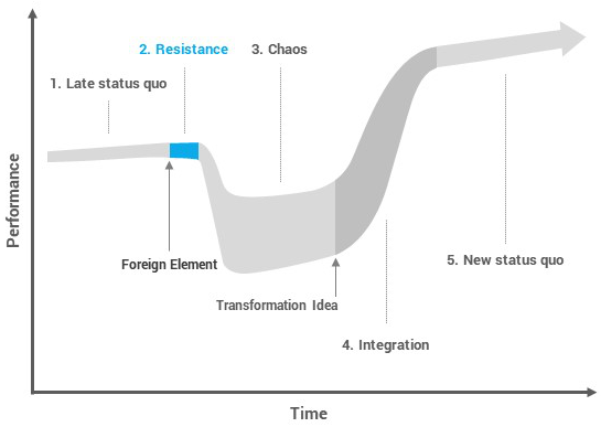 为了确保组织体系健康、平衡,组织需要认真地接受、调研并整合有用的外来因素。即使做到了以上几点,变革还是会不可避免的来到第二阶段——“Resistance”/阻力期。