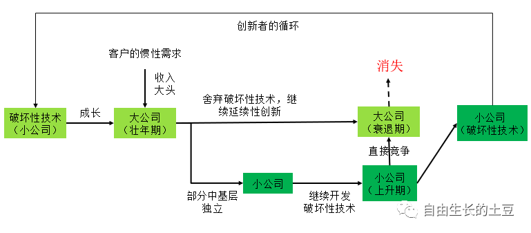 通过上图循环阐述什么是“创新者的窘境”。一般来说,大公司成熟客户占比收入比较高,受限于成熟客户的惯性需求,维持过去的利益格局和收入,大公司会继续选择延续性创新,停滞在原产品体系中。同时,会不断排挤或舍弃破坏性技术创新产品和人员,导致部分中基层人员离职出走成立小公司,小公司继续深入和培育研发破坏性技术。然而,在市场竞争中,大公司产品的竞争力远不如小公司的破坏性技术产品,导致大公司迅速消失,而后小公司快速成长,成为大公司,继续重复原来的老路,被新破坏性技术打败。正如谚语所说,“屠龙少年逐渐长出了龙鳞”。 如:柯达胶卷和数码相机,柯达胶卷发明第一台数码相机,但是最终被数码相机打败。