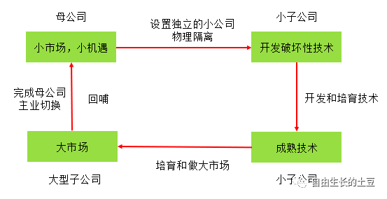 要打破创新者的窘境,最关键的一点是在母公司内部设置独立的机构负责开发破坏性技术,实现物理隔离,两种不同的技术,面对着不同的价值网和价值客户,两种模式很难在一个体系中并存。同时,容许破坏性技术试错,未来的机会并不能确切知道在哪里。破除创新者的窘境的过程设计框架如下: