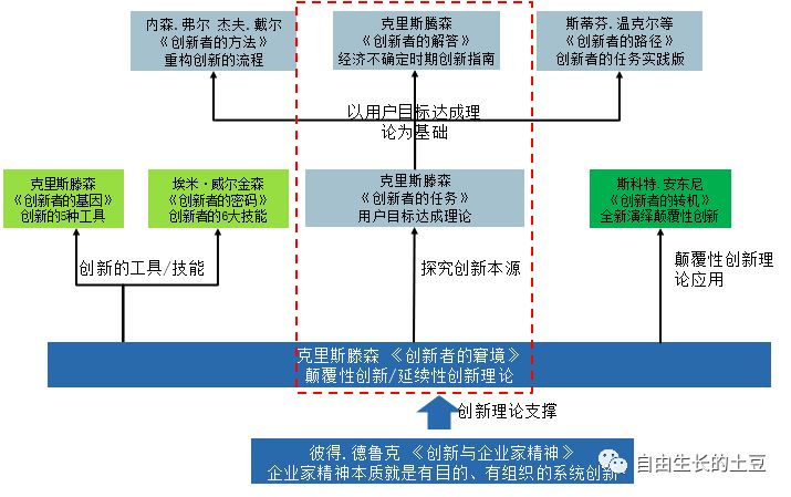 1997年他写了第一本关于创新者的书-创新理论的奠基之作《创新者的窘境》,革命性地提出“颠覆性创新/延续性创新”理论,在此基础上衍生出一系列关于创新的工具/技能、目的、颠覆性创新理论应用等著作,并且书名都称作《创新者的XX》,系列书籍的逻辑架构如下图。基于用户目标达成理论,衍生出内森.弗尔的《创新者的方法》、克里斯坦森的《创新者的解答》和斯蒂芬.温克尔的《创新者的路径》等实现用户目标达成的流程方法。