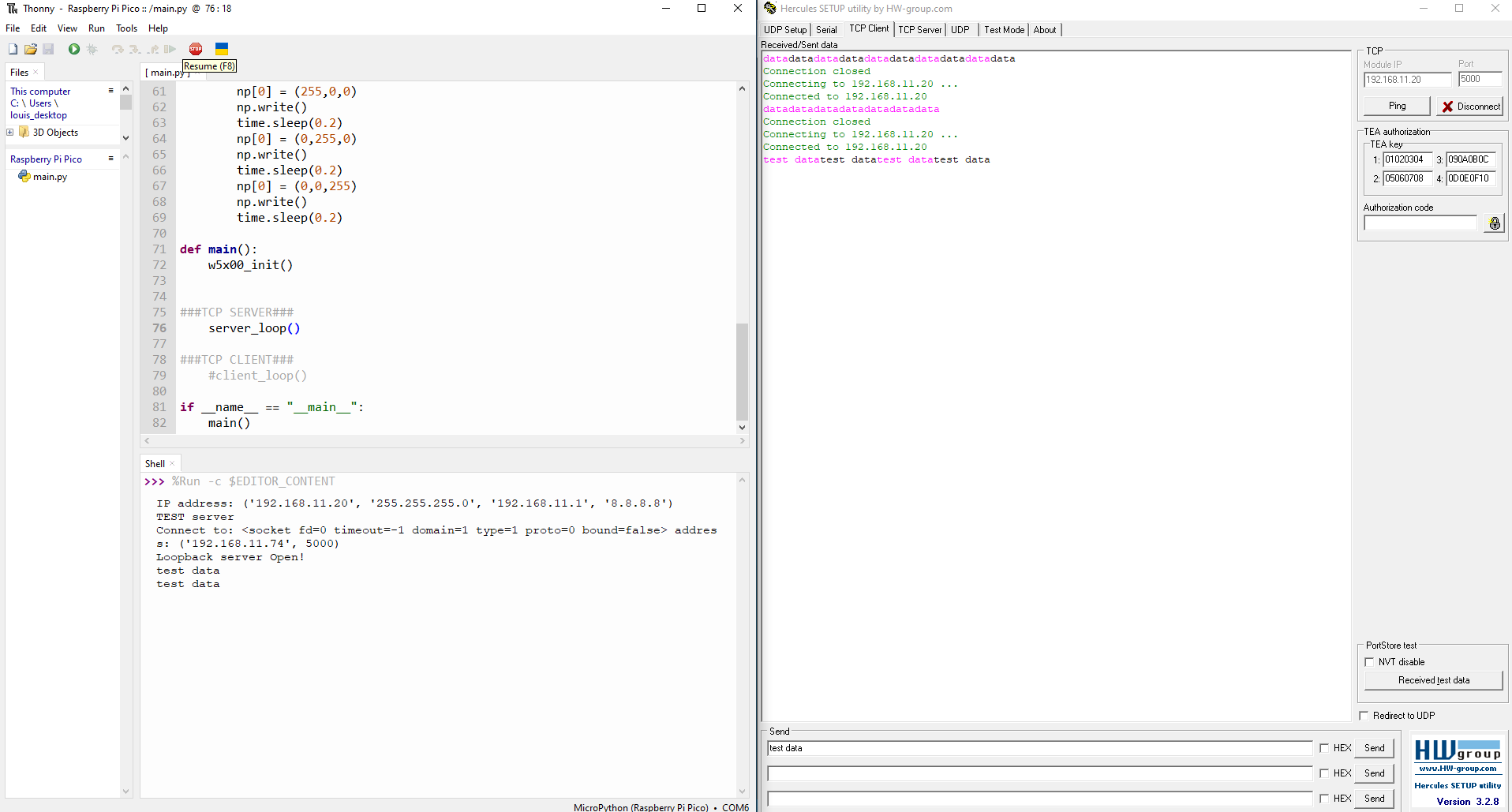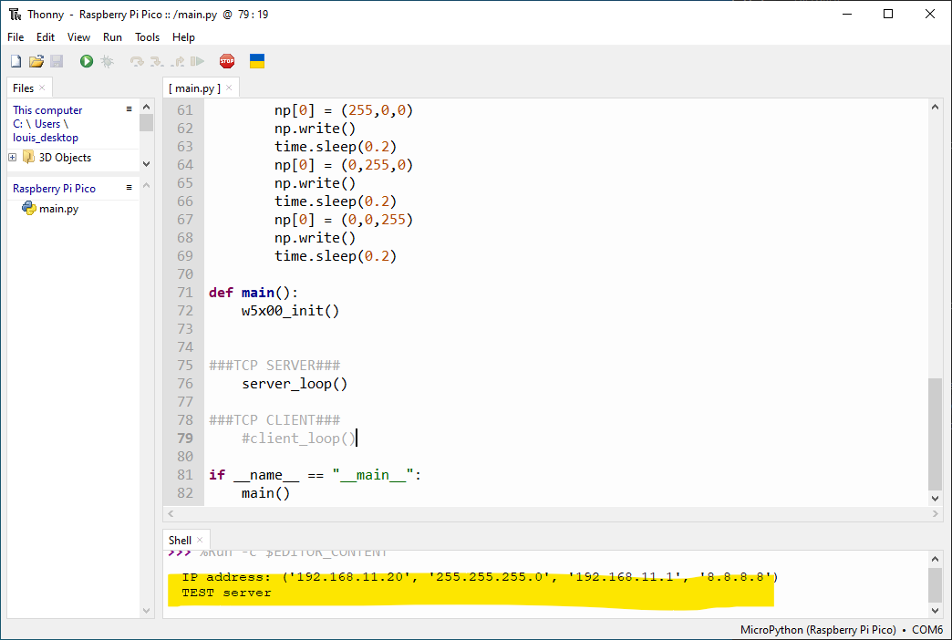 由于 W5100S-XIAO 板将充当服务器,因此启用 server_loop() 函数并运行代码以等待客户端连接。 运行代码时,IP 地址信息将显示如下。