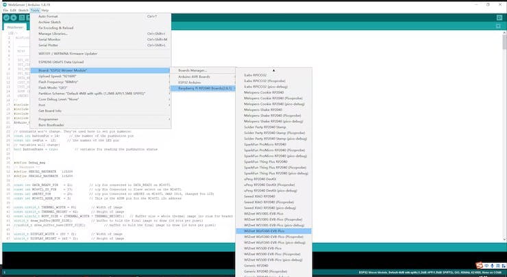 “工具->开发板:“***”-> Raspberry Pi RP2040 开发板(2.6.1) " 选择“WIZnet WizFi360-EVB-PICO”。