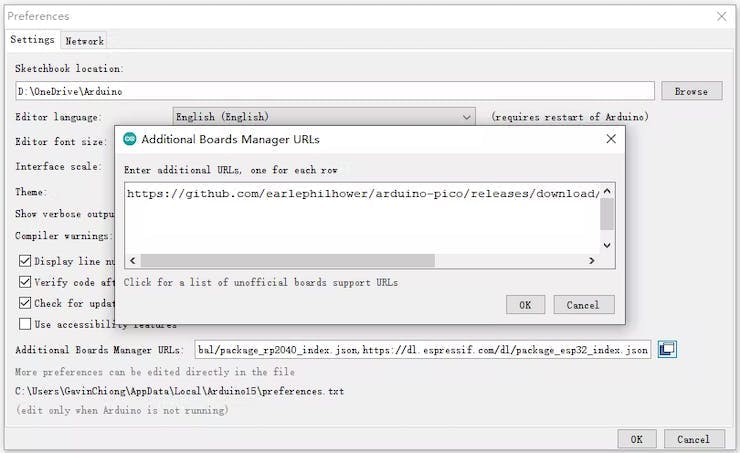在弹出的对话框中,在“其他 Boards Manager URL”字段中输入以下 URL: