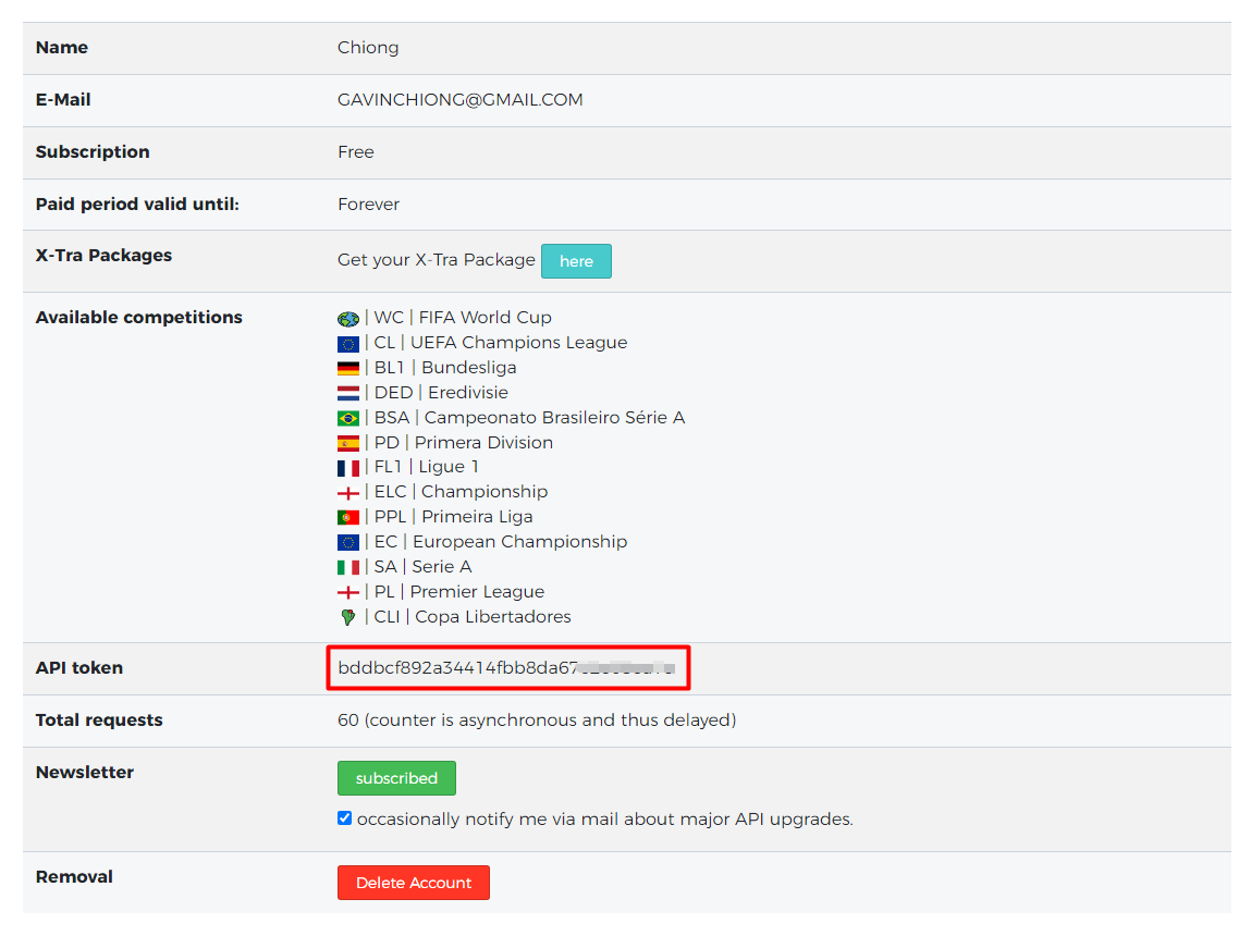 第一步:在足球数据网站创建新账户并获取API TOKEN;