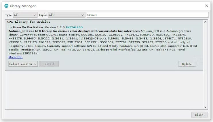 添加“GFX Library for rduino”,该库支持圆屏GC9A01。