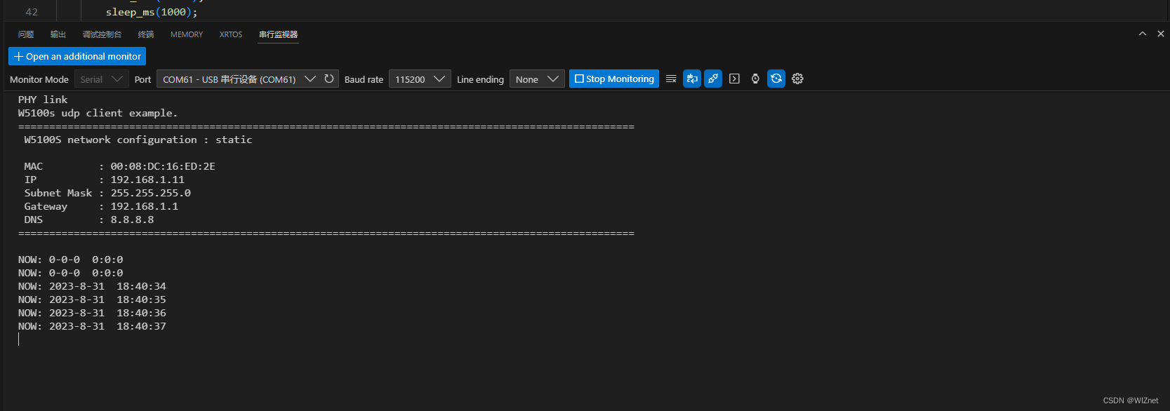 编译烧录后,打开串行监视器,即可看到在打印的实时时间信息,前两次打印为0是由于socket端口未开启和开启后首次发送请求前这两次状态期间,尚未获得时间数据,因此打印的是初始化赋的0,如下图所示: