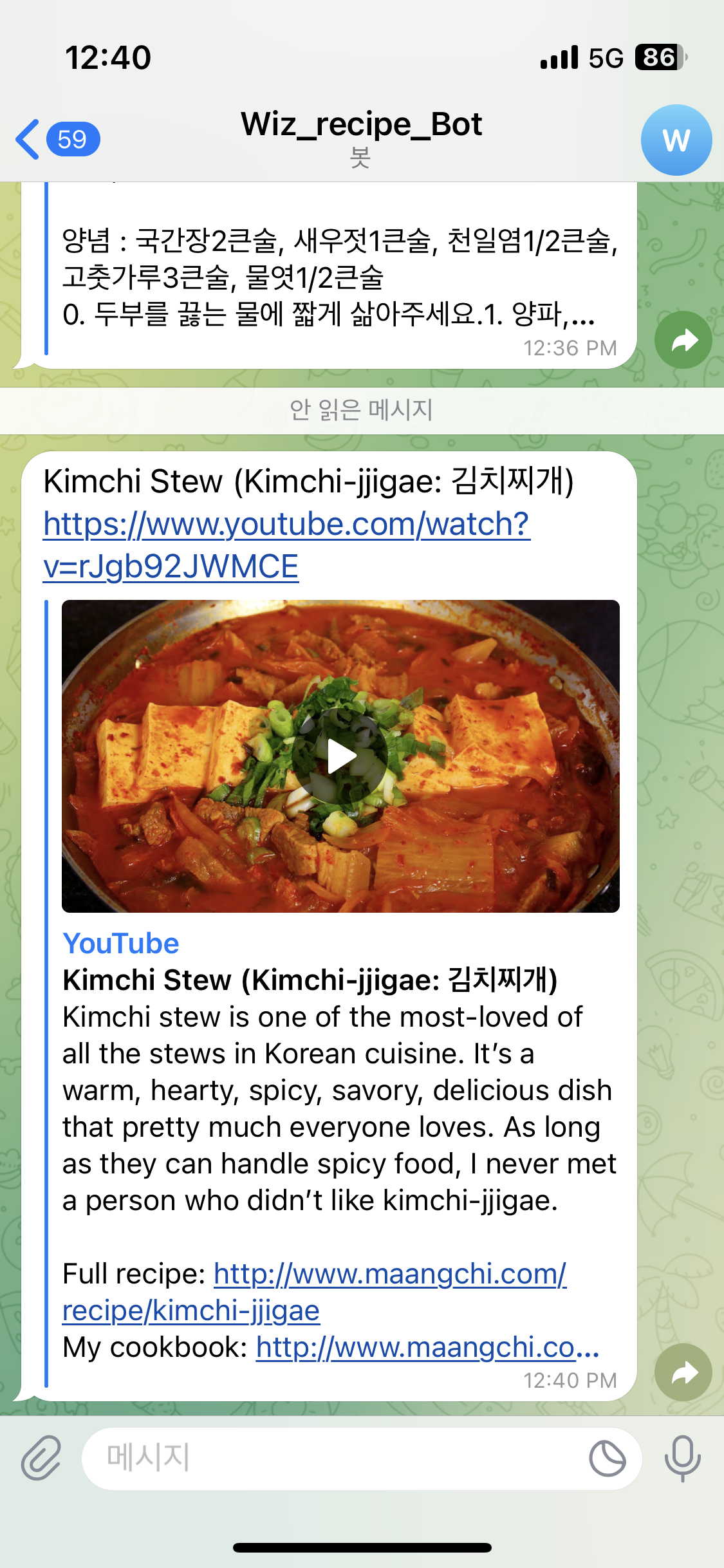 在 Telegram 消息中向用户发送菜单推荐和 YouTube 视频链接。