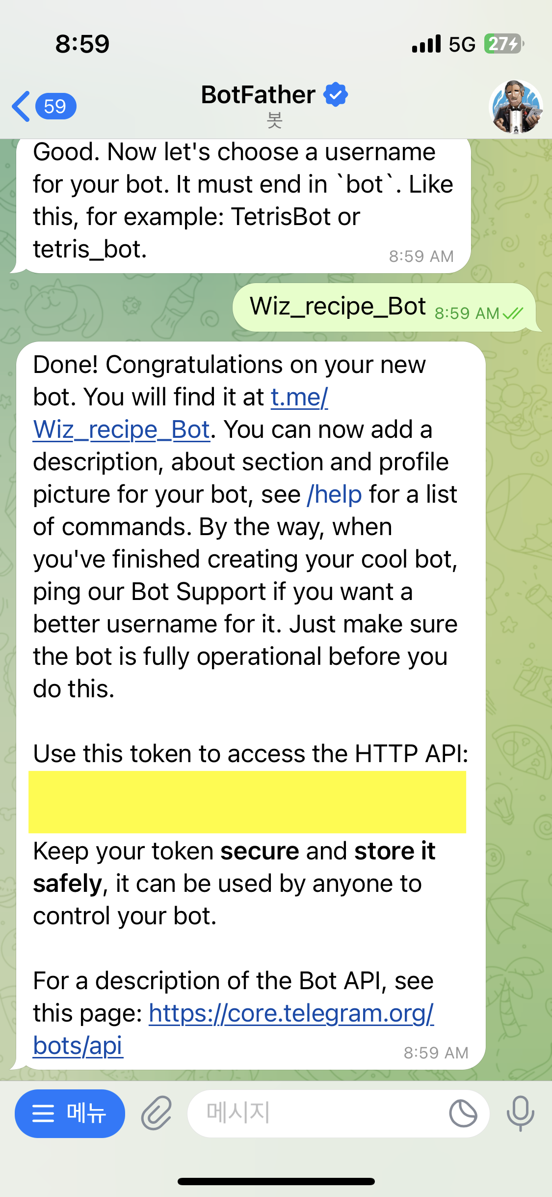 如果您看到这样的令牌,则您的机器人已创建。 我们向机器人发送一条消息“你好”