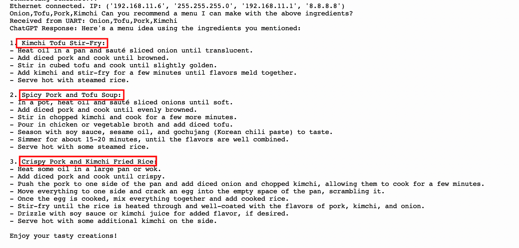Pico 通信并接收 Raspberry Pi 4 推断的数据,并利用以太网通信使用 chatGPT 进行菜单推荐。