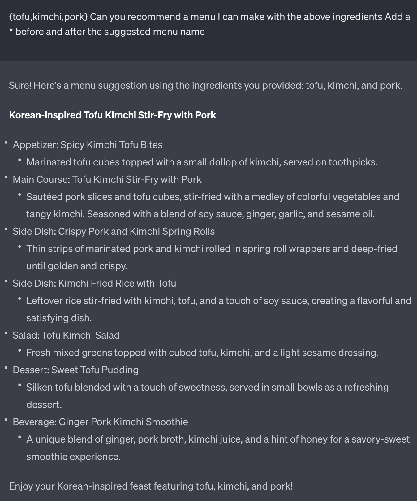如上所示,GPT 会通过简单的菜谱提出菜单建议。