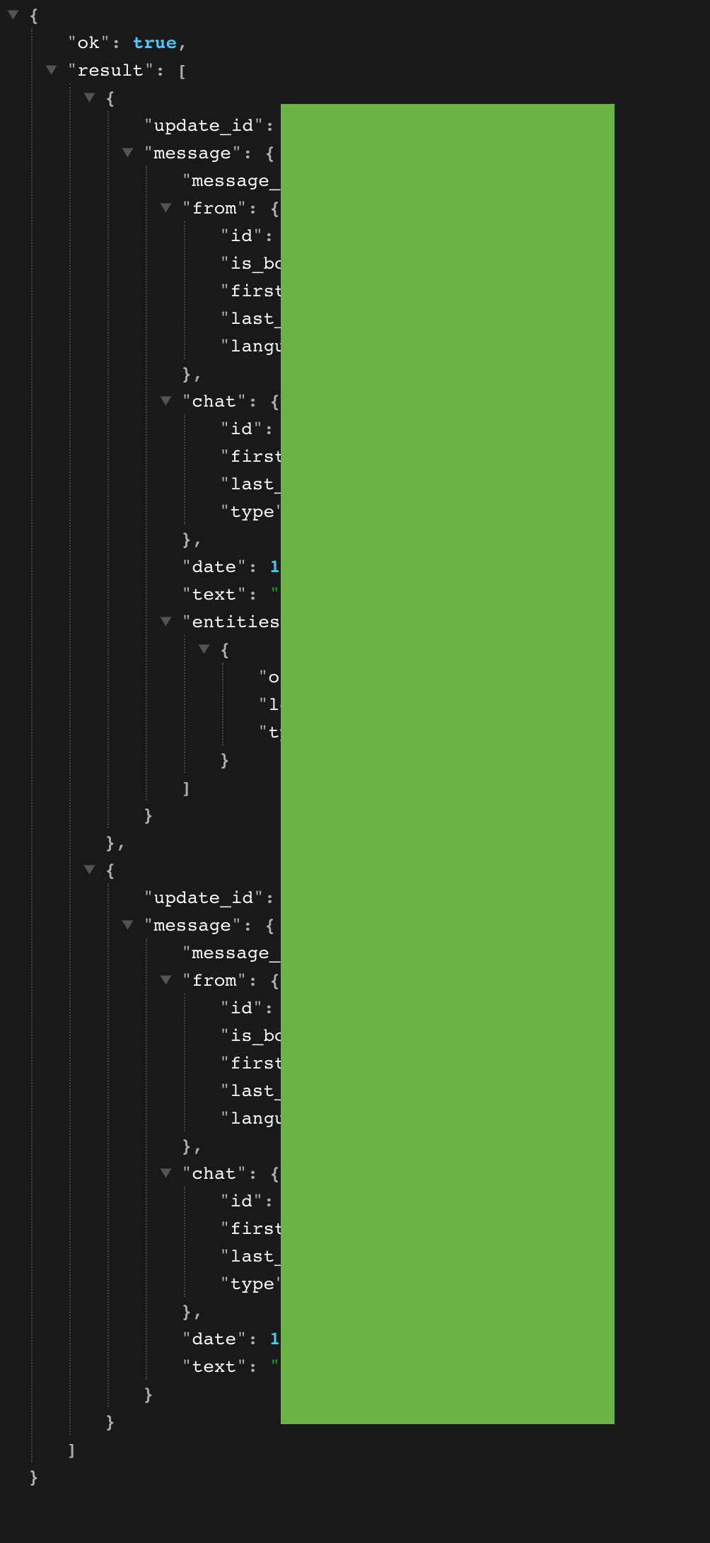 如果您访问上面的网页,您将看到您发送的消息和您的信息的 JSON 文件。 从那里,您可以保存您的 ID 并检查消息是否已成功发送。