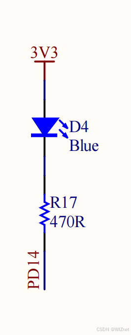 在本教程中W55MH32芯片与LED灯的连接见图LED硬件原理图 :