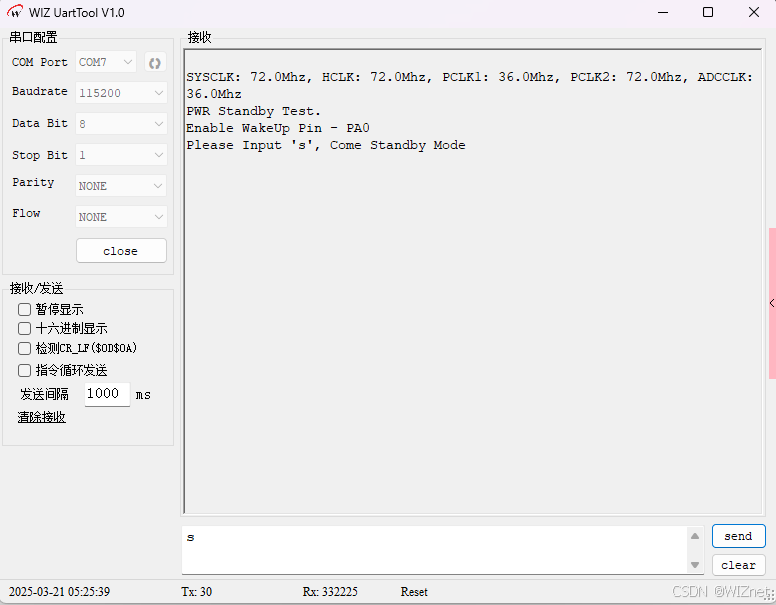 这段代码的主要功能是允许用户通过串口输入 s 命令使 W55MH32 设备进入待机模式,同时使能了唤醒引脚(PA0),可以在待机模式下通过该引脚唤醒设备。在进入待机模式前,将所有 GPIO 引脚配置为模拟输入模式以降低功耗。通过串口可以输出系统时钟频率信息和操作提示。