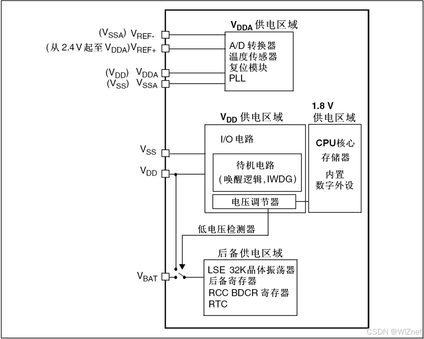 从框图了解到,W55MH32的电源系统主要分为备份域电路、内核电路以及ADC电路三部分,介绍如下: