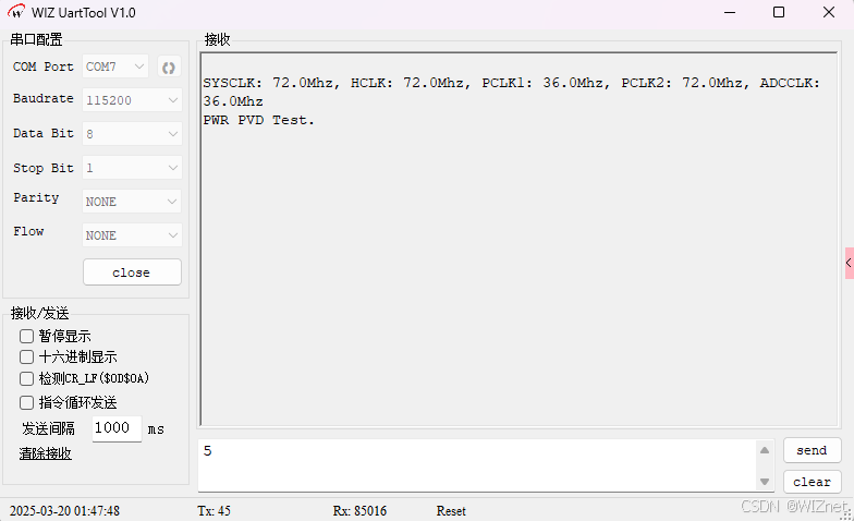 这段代码通过配置 PVD 功能,实时监测电源电压,并在电压高于或低于设定阈值时触发中断,通过串口输出相应的提示信息。同时,还配置了串口通信功能,用于输出系统时钟频率信息和 PVD 监测结果。