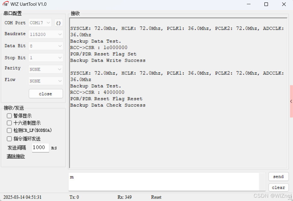 - 检查复位标志RCC_FLAG_PORRST:若该标志置位,表明是 POR/PDR 复位,调用WriteToBackupReg函数写入数据,并输出写入成功信息。