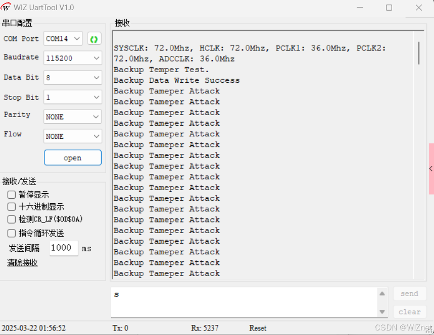 - 调用CheckBackupReg函数检查备份寄存器中的数据:若数据检查成功,串口输出 “Backup Data Check Success”。