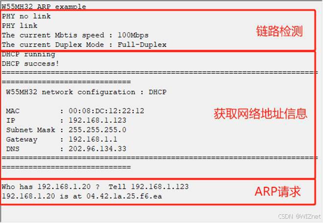 该例程用到的其他网络协议,例如 DHCP,请参考相关章节。有关 W55MH32 的初始化过程,请参考 Network Install 章节,这里将不再赘述。