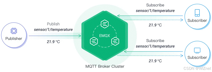 MQTT 发布/订阅模式有 4 个主要组成部分:发布者、订阅者、代理和主题。