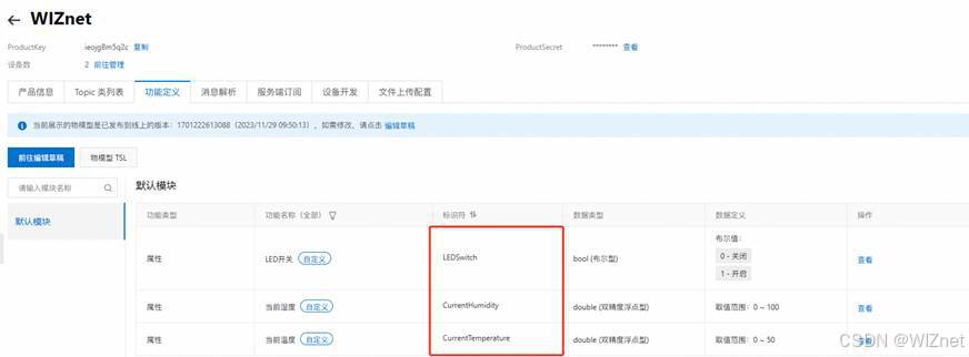 创建产品和添加物模型:登录阿里云物联网平台,创建产品并在产品下添加以下物模型功能。
