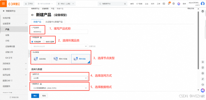 设置产品名称、所属品类、节点类型、连网方式、数据格式